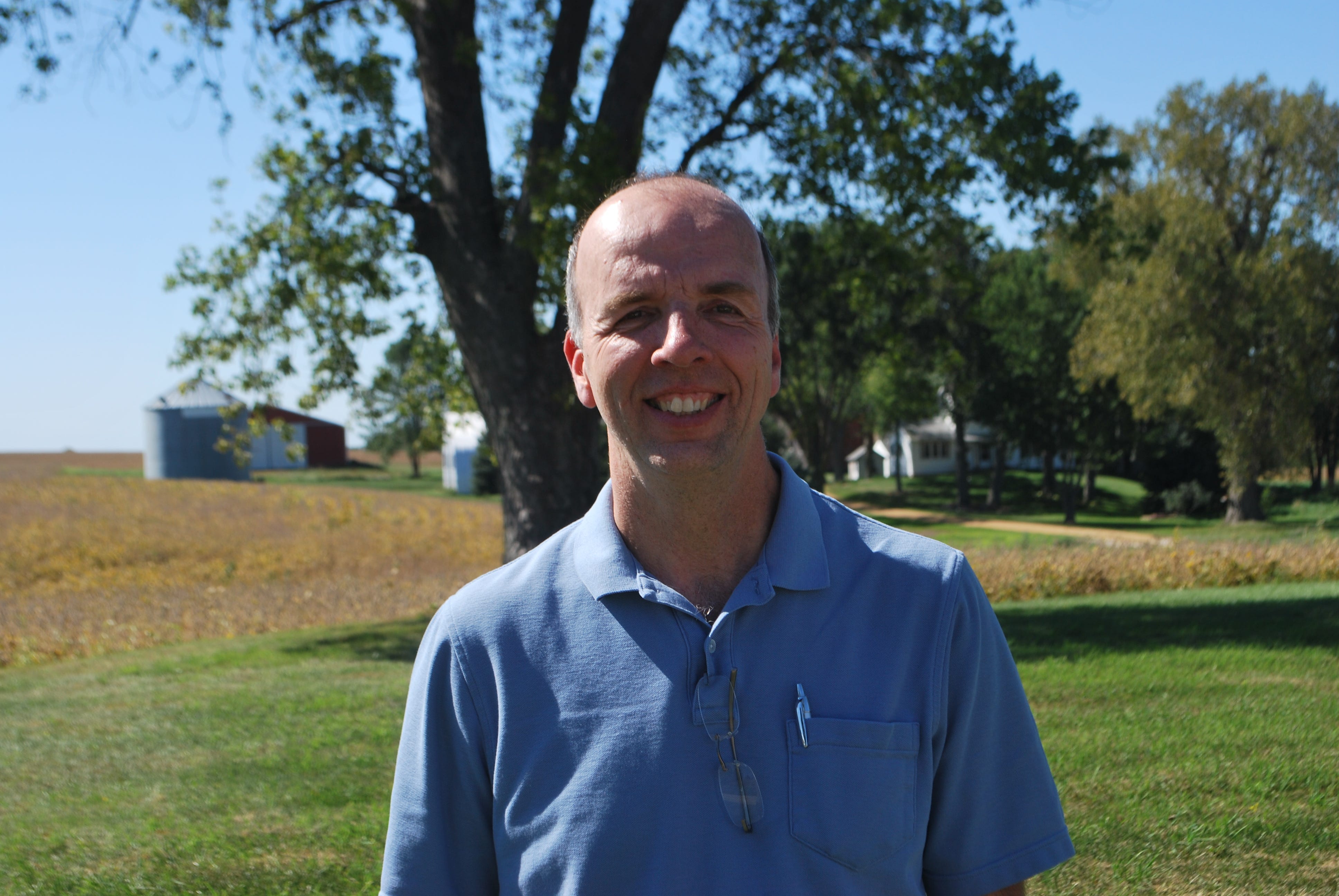 Mike Vock, standing in front of the farm outside of Polo, Ill., where he grew up.